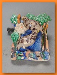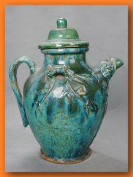 在追溯石灣藝術(shù)陶瓷的源流時(shí),我們很多時(shí)會(huì)想到河宕遺址的印紋陶或者瀾石的古墓葬出土的陪葬物,但這不應(yīng)該成為石灣藝術(shù)陶的真正源流。正如陶器的出現(xiàn),世界各地是不需要互相學(xué)習(xí)而自發(fā)產(chǎn)生的。印紋陶和漢墓葬在全國(guó)范圍內(nèi)許多地方都有出現(xiàn),在石灣及周邊地區(qū)出土的陶器并未顯露出后來(lái)石灣窯藝術(shù)陶瓷的明顯特征,只可以說(shuō)明石灣地區(qū)開(kāi)始有人做陶,隱含了制陶的基因。石灣藝術(shù)陶瓷真正起源于明代,這是得到眾多文化學(xué)者的認(rèn)同。在藝術(shù)陶的五大種類(lèi)中,較早出現(xiàn)的是藝術(shù)器皿。明代蘇可松的《翠毛釉貫耳瓶》是現(xiàn)今保存較好的有作者姓名,年代確切的作品。根據(jù)記載,明代陳粵彩、楊升、揚(yáng)名都是擅于制作器皿的名家,雖然沒(méi)有見(jiàn)到過(guò)他們作品的存世品,但他們的名字能流傳下來(lái),作品也不是一般的日用器。“陳粵彩經(jīng)常使用醬黃釉、綠釉等制作器物,作品較為細(xì)致整齊”,“楊名傳世器多仿古銅器,精制黑釉,常用黑白兩種釉色,簡(jiǎn)潔樸素”,“楊升作品多仿漢代銅器式樣,擅長(zhǎng)粉藍(lán)色釉”。這些明代的陶藝名家做的已不是一般的日用陶器,在造形和施釉方面都有一定追求的工藝美術(shù)品,作品因廣受歡迎和珍惜才會(huì)使作者留名后世。從清代大量生產(chǎn)的日用器皿,有不少看到藝術(shù)陶器的影子。如白釉行(古石灣陶業(yè)行會(huì)之一)的飯豉(罐),用于從廚房的大鐵鍋里盛飯到飯廳的容器,上面有浮雕龍、雞等圖案裝飾,還覆蓋了漂亮的黃釉或綠釉;花盆行(古石灣陶業(yè)行會(huì)之一)的藥酒壺(高約80~90厘米),以龍頭作壺嘴,梅花或竹裝飾壺耳;掛在墻上的掛壁,裝飾以動(dòng)植物的造型,中空又可盛水養(yǎng)植物?傊,石灣生產(chǎn)的陶瓷制品中既實(shí)用又美觀的比比皆是。石灣日用陶瓷的生產(chǎn)始于唐宋,到明清達(dá)到鼎盛。隨著銷(xiāo)售的暢旺、見(jiàn)識(shí)的增加,將日用陶器做得更精美,提高其附加值,這是石灣制陶者和商家很易會(huì)想到的,日用陶器的造型也從簡(jiǎn)單到復(fù)雜,釉色從單調(diào)到豐富,從而促使石灣藝術(shù)器皿的產(chǎn)生和成熟。