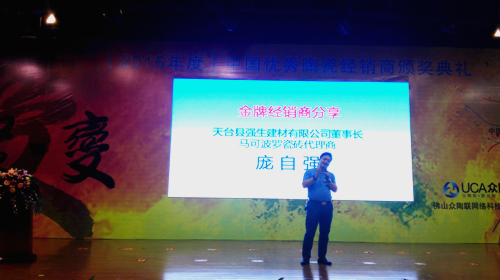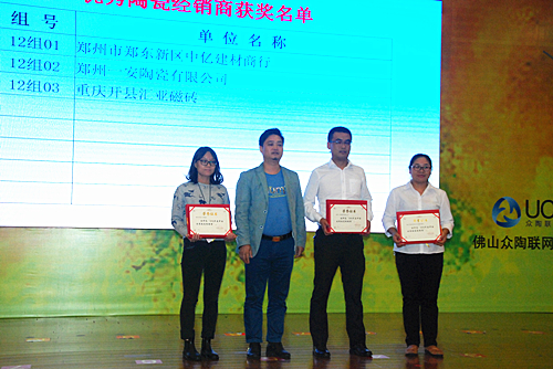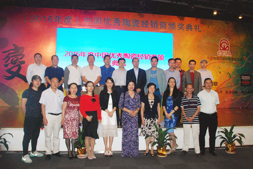 2016年度中國(guó)優(yōu)秀陶瓷經(jīng)銷(xiāo)商頒獎(jiǎng)典禮在10月19日的下午于瓷海國(guó)際陶瓷交易中心五樓會(huì)議室隆重舉行。出席此次頒獎(jiǎng)典禮的主要嘉賓有:中國(guó)陶瓷工業(yè)協(xié)會(huì)副理事長(zhǎng)浦永祥;中國(guó)陶瓷工業(yè)協(xié)會(huì)秘書(shū)長(zhǎng)、營(yíng)銷(xiāo)分會(huì)秘書(shū)長(zhǎng) 候文全;中國(guó)陶瓷工業(yè)協(xié)會(huì)副秘書(shū)長(zhǎng) 樊瑞新;廣東東鵬控股有限公司總裁、佛山眾陶聯(lián)網(wǎng)絡(luò)科技有限公司總裁 蔡初陽(yáng);瓷海國(guó)際·佛山陶瓷交易中心副總經(jīng)理 林瑩;中國(guó)陶瓷工業(yè)協(xié)會(huì)營(yíng)銷(xiāo)分會(huì)專(zhuān)職副會(huì)長(zhǎng)于楓;中國(guó)陶瓷工業(yè)協(xié)會(huì)營(yíng)銷(xiāo)分會(huì)副會(huì)長(zhǎng)、廣東陶瓷協(xié)會(huì)會(huì)長(zhǎng) 陳環(huán);中國(guó)陶瓷工業(yè)協(xié)會(huì)營(yíng)銷(xiāo)分會(huì)副會(huì)長(zhǎng)、廣東省陶瓷協(xié)會(huì)秘書(shū)長(zhǎng) 陳振廣;中國(guó)陶瓷工業(yè)協(xié)會(huì)營(yíng)銷(xiāo)分會(huì)副會(huì)長(zhǎng)、佛山泉州商會(huì)會(huì)長(zhǎng),香港匯誠(chéng)集團(tuán)董事長(zhǎng)蔡世銓?zhuān)恢袊?guó)陶瓷工業(yè)協(xié)會(huì)營(yíng)銷(xiāo)分會(huì)副會(huì)長(zhǎng)、南莊鎮(zhèn)公有資產(chǎn)管理辦公室主任 潘大倉(cāng);中國(guó)陶瓷工業(yè)協(xié)會(huì)營(yíng)銷(xiāo)分會(huì)副會(huì)長(zhǎng)、廣東新明珠集團(tuán)(廣佛)有限公司董事長(zhǎng) 唐小梅;中國(guó)陶瓷工業(yè)協(xié)會(huì)營(yíng)銷(xiāo)分會(huì)副會(huì)長(zhǎng)、天臺(tái)縣強(qiáng)生建材有限公司董事長(zhǎng) 龐自強(qiáng);中國(guó)陶瓷工業(yè)協(xié)會(huì)營(yíng)銷(xiāo)分會(huì)副會(huì)長(zhǎng)、佛山市格里菲斯建材有限公司總經(jīng)理 羅新家;中國(guó)陶瓷工業(yè)協(xié)會(huì)營(yíng)銷(xiāo)分會(huì)常務(wù)副秘書(shū)長(zhǎng) 姜崇;肇慶大將軍陶瓷有限公司董事長(zhǎng)柳朝陽(yáng);廣東新明珠陶瓷集團(tuán)有限公司營(yíng)銷(xiāo)總經(jīng)理 彭新峰等相關(guān)領(lǐng)導(dǎo)及各地經(jīng)銷(xiāo)商代表。