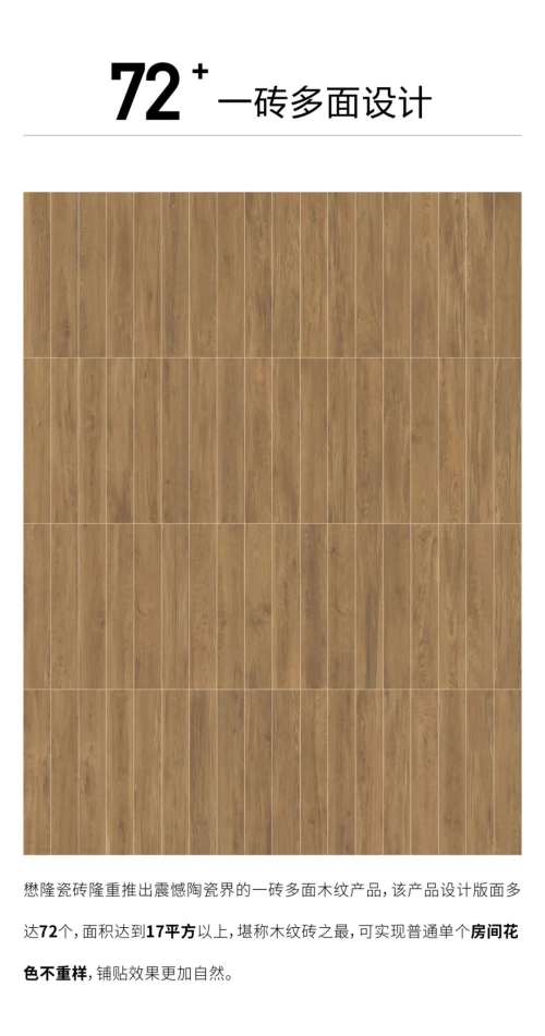 本屆展會(huì),懋隆瓷磚將帶來(lái)震撼陶瓷界的一磚多面木紋產(chǎn)品,該產(chǎn)品設(shè)計(jì)版面多達(dá)72個(gè),面積達(dá)到17平方以上。那么今天,讓我們一起跟隨小陶的步伐,提前走進(jìn)懋隆瓷磚感受一下吧!