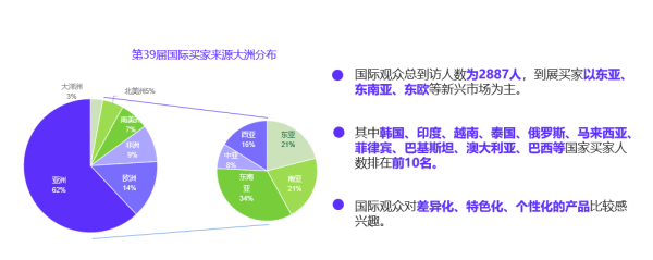▲佛山陶博會(huì)運(yùn)營總監(jiān)陳智鵬 01 第39屆秋季佛山陶博會(huì)的總體情況 1、 第39屆秋季佛山陶博會(huì)總展覽規(guī)模50萬+平方米,總參展品牌828家,發(fā)布新品30000+款,參觀人數(shù)63056人,舉辦主題活動(dòng)65場次,直播活動(dòng)15場次,總直播訪問量402132人次。 2、 在客流版塊,整體呈現(xiàn)出國際客流、中國陶瓷城展館客流強(qiáng)勁復(fù)蘇的態(tài)勢。 3、 在國內(nèi)買家的產(chǎn)品需求方面,特色磚(防滑、耐磨、色磚、房屋、小磚、花磚等)關(guān)注度最高,其次是大板/巖板、仿古磚、瓷磚美縫/輔材、智能衛(wèi)浴等品類。 4、 在國際買家的產(chǎn)品需求方面,對(duì)差異化、特色化、個(gè)性化的產(chǎn)品比較感興趣。