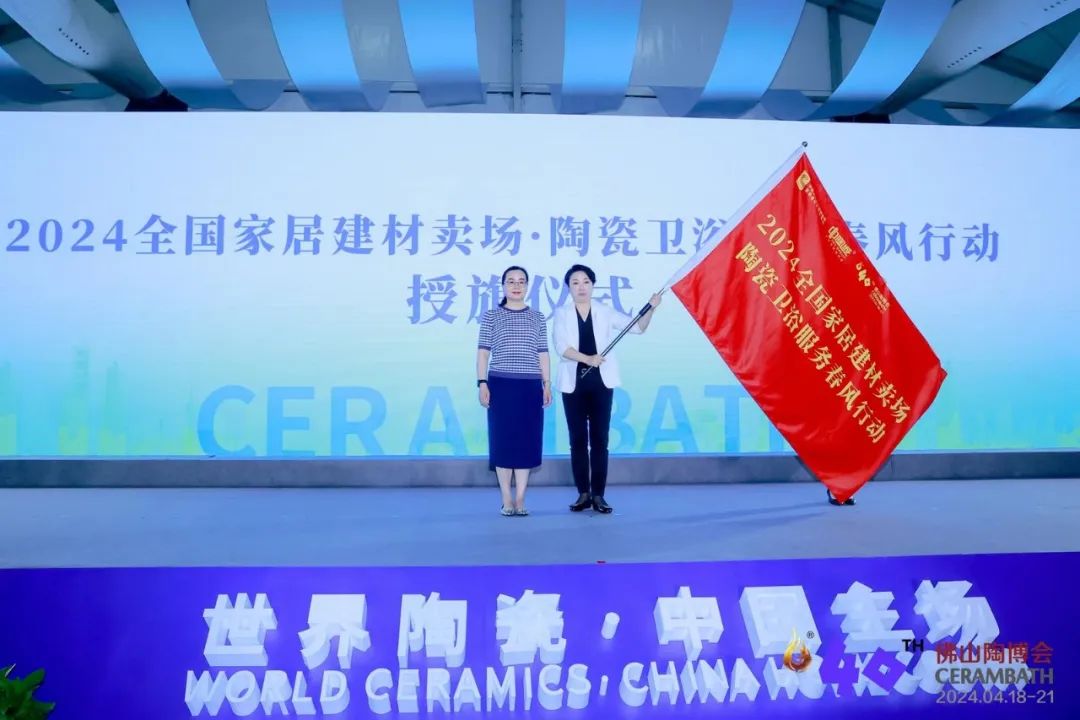 為進一步助力經(jīng)銷商轉(zhuǎn)型升級與發(fā)展,提供更加優(yōu)質(zhì)與系統(tǒng)性服務(wù),佛山陶博會與中國建筑材料流通協(xié)會家居市場專委會聯(lián)手,推出“2024全國家居建材賣場·陶瓷衛(wèi)浴服務(wù)春風(fēng)行動”。在開幕式現(xiàn)場,中國建筑材料流通協(xié)會副會長兼常務(wù)秘書長、家居建材市場專委會主席張彩虹向佛山中陶城集團副總裁、中國陶瓷衛(wèi)浴總部總經(jīng)理、中國淄博陶瓷總部總經(jīng)理湯潔明授予旗幟。