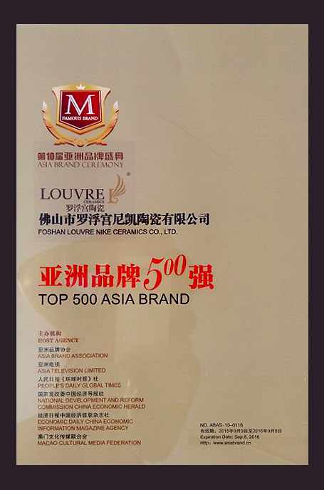2015年9月9日,以“品牌決勝未來”為宗旨的第十屆“亞洲品牌500強(qiáng)”頒獎典禮在澳門隆重舉行,來自亞洲各國政要、商業(yè)巨擘及各行業(yè)精英領(lǐng)袖嘉賓出席會場。三星、海爾、五糧液等亞洲領(lǐng)導(dǎo)品牌紛紛入選。作為國際高端瓷磚品牌代表,羅浮宮陶瓷以高端領(lǐng)先的行業(yè)地位和持續(xù)創(chuàng)新的工藝技術(shù),實現(xiàn)四年蟬聯(lián)“亞洲品牌500強(qiáng)”榜單,再次彰顯其品牌地位和影響力。