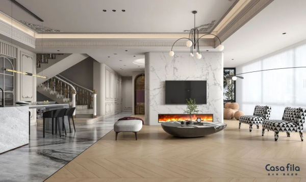 細膩的紋理變化,似奔涌而至的煙霞霧氣,帶著一種深邃如詩的質(zhì)樸美,在空間中自由延展,觸手可及的質(zhì)感,保留原始的天然氛圍,于繁復(fù)中還原生活的純粹。